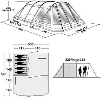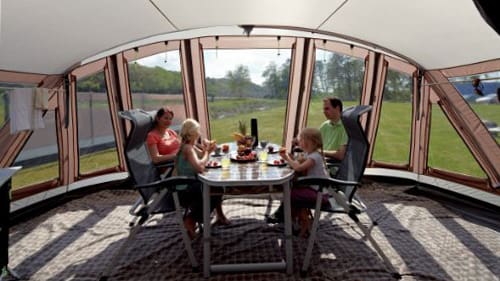 5人用の2ベッドルーム、リビング、パノラマルームのトンネル型テントです。4本のスチールポールで構成されたフレームにはウインドスタビライザーシステムを装備。ビューフォード風速階級10に対応する「クラス10」仕様で、風が強いキャンプ場でも非常に安定しています。