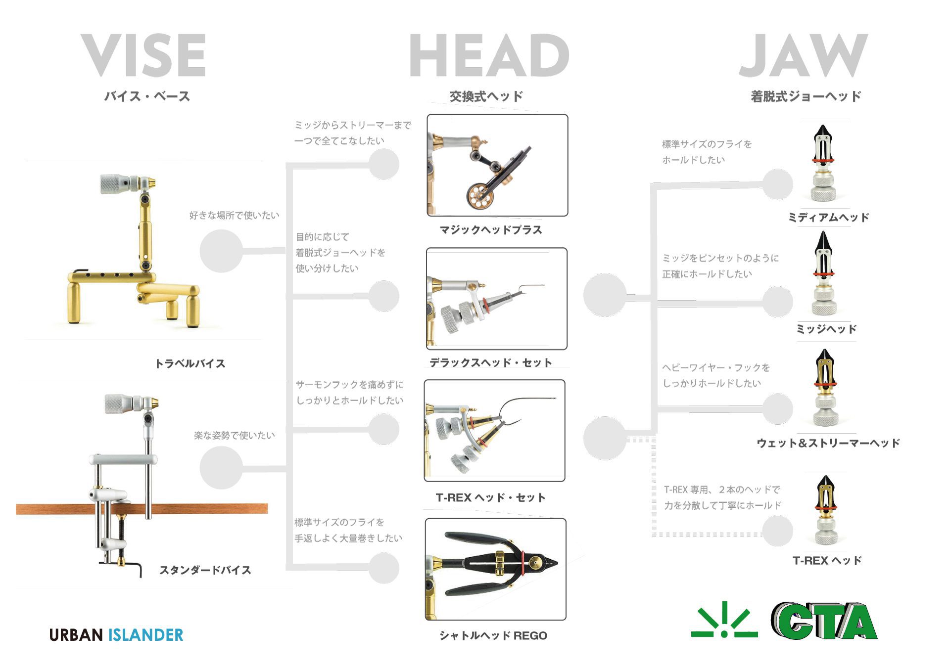 コッタレッリのデザインが革新的である理由。それはフライを形作る最も重要なパーツである「フック」を保持するジョーの部分を着脱式の「ヘッド」として捉え直し、タイヤーが求める創造性・機能性・快適性から使いたいヘッドを選ぶことができる点です。バイスのプラットフォームは、デスクにしっかりと固定させてタイヤーにとって体へ負担をかけずに理想的なポジションへセッティングしやすい「クランプ&アーム」のスタンダードバイスと、簡単に移動できて使う場所を選ばない「トライポッド」のトラベルバイスのシステムとなっています。