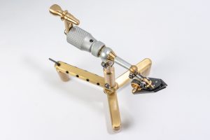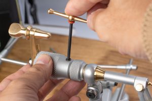 内側の小さなロータリーノブはベースへの着脱および固定、外側の大きなロータリーノブはジョー先端の締め付けに使います。