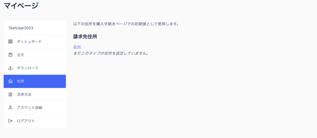 「追加」をクリックすると請求先住所(配送先と同じとなっています)を登録できます。