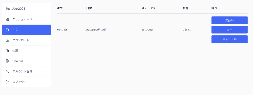 完了した注文や処理中の注文はリスト表示されます。決済が完了していない注文の場合は「支払い」ボタンをクリックすると決済画面が開きます。また「キャンセル」をクリックすることで、決済前にキャンセルすることができます。