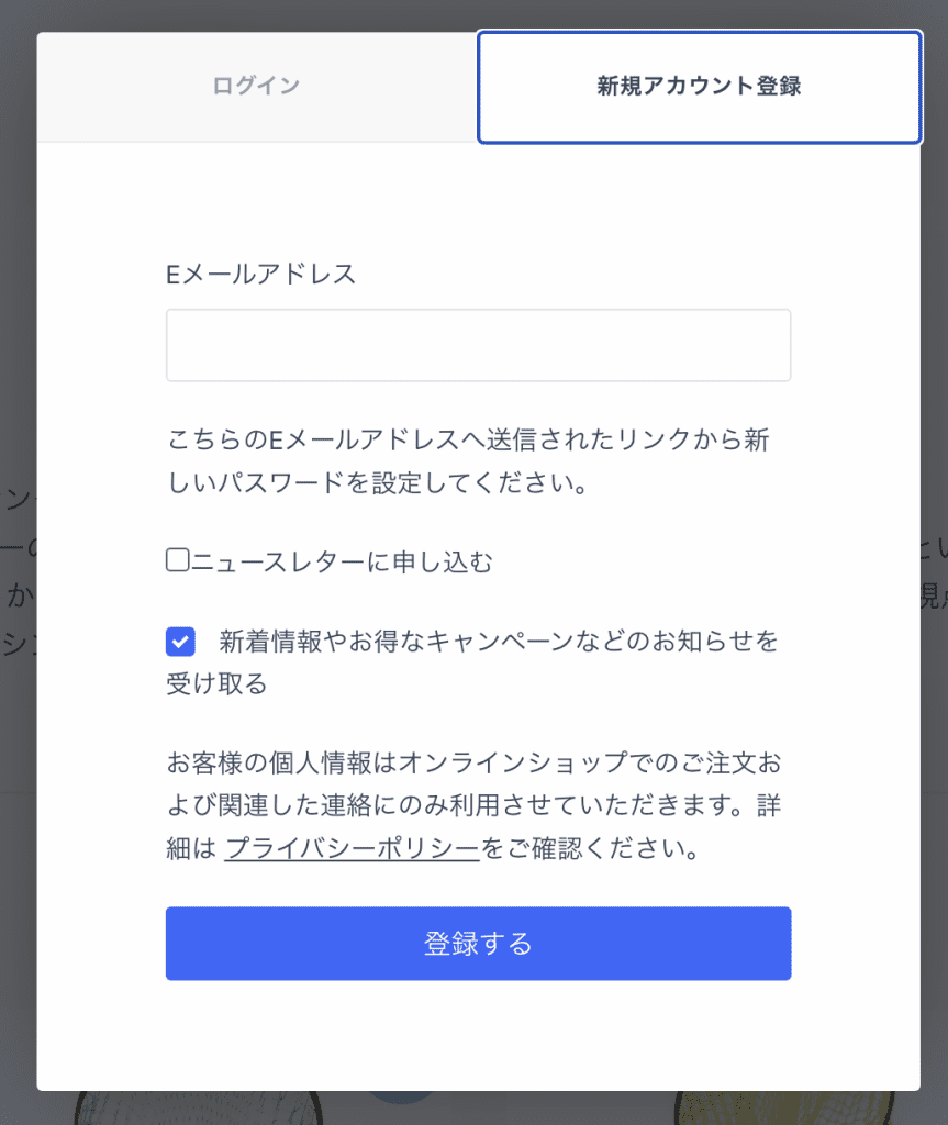 ショッピングでお使いになられるEメールアドレスを正しく入力して「登録する」ボタンをクリックしてください。