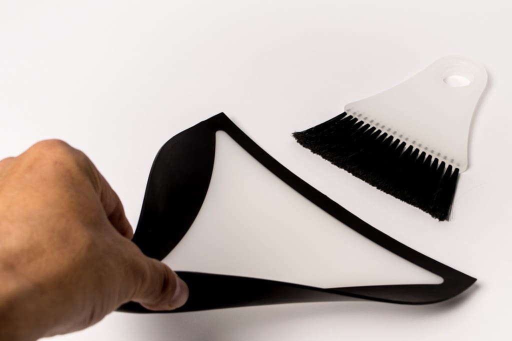 チリトリはダストパン部分はフラットなプラスチック、エッジをポリメックスにすることで、ボディを柔軟に曲げて使うことで、平たい床からのゴミを集めやすく設計されています。