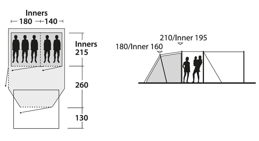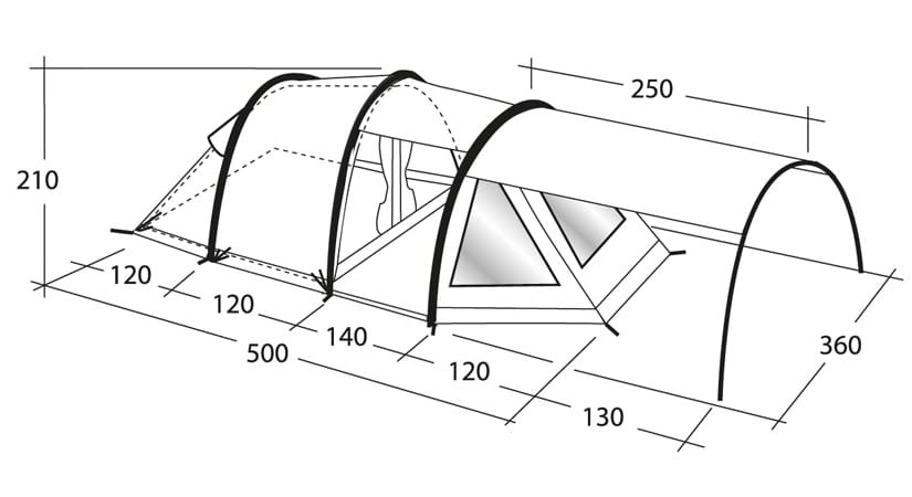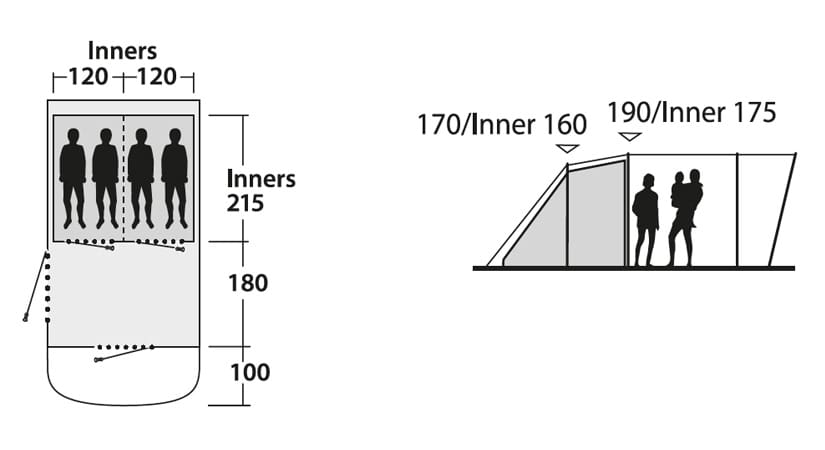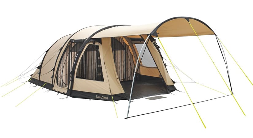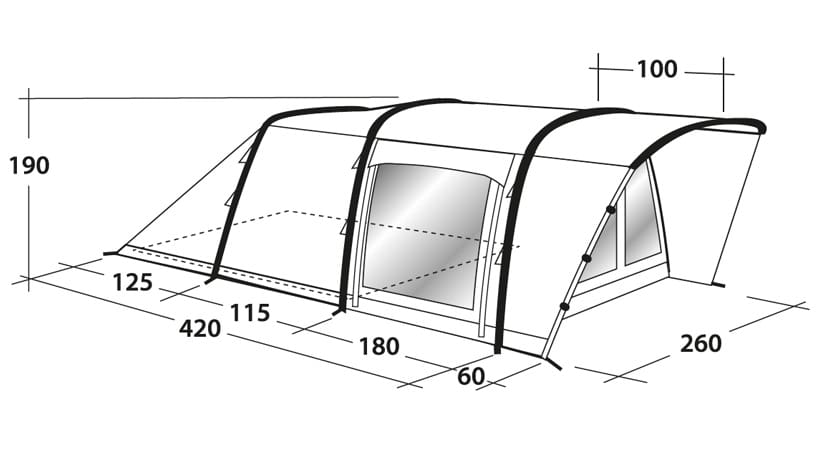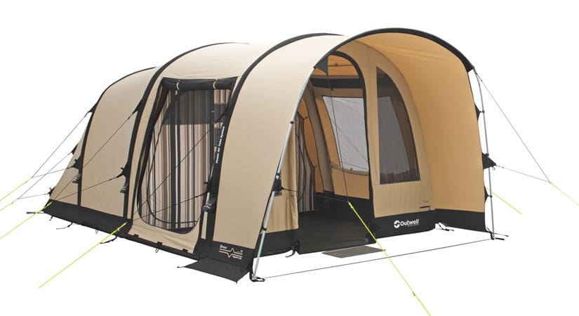 従来型のOutwellテントにエアチューブシステムを融合させた、4人用の2ベッドルーム、リビング、固定式オーニング付きのエアインフレータブルテントです。リビングルームのサイドはハンガーポイントとして使えるサイドバーで安定性を高めています。