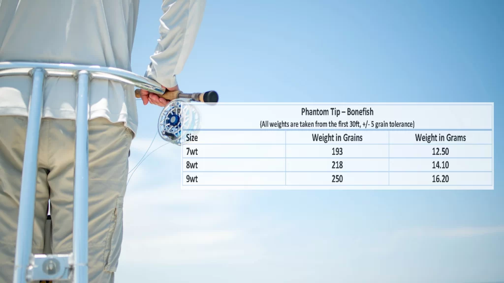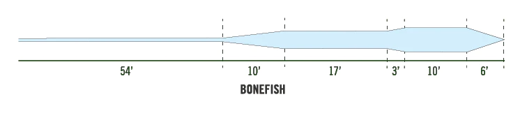 ウェイト付きソルトフライを風の中で使うシーンでも直進力を失わないロングキャスト向けの46フィートヘッドのボーンフィッシュテーパーは、パワフルでありつつも着水が静かな後端部分のテーパー設計で、30フィートの近接戦から90フィート先のテイリングまで余すことなくボーンフィッシュとのやり取りをしやすいデザインになっています。シューティング部分もいたずらに細くせず、横風でも直進性を失わないながらもロングキャストできるギリギリの直径に設計。