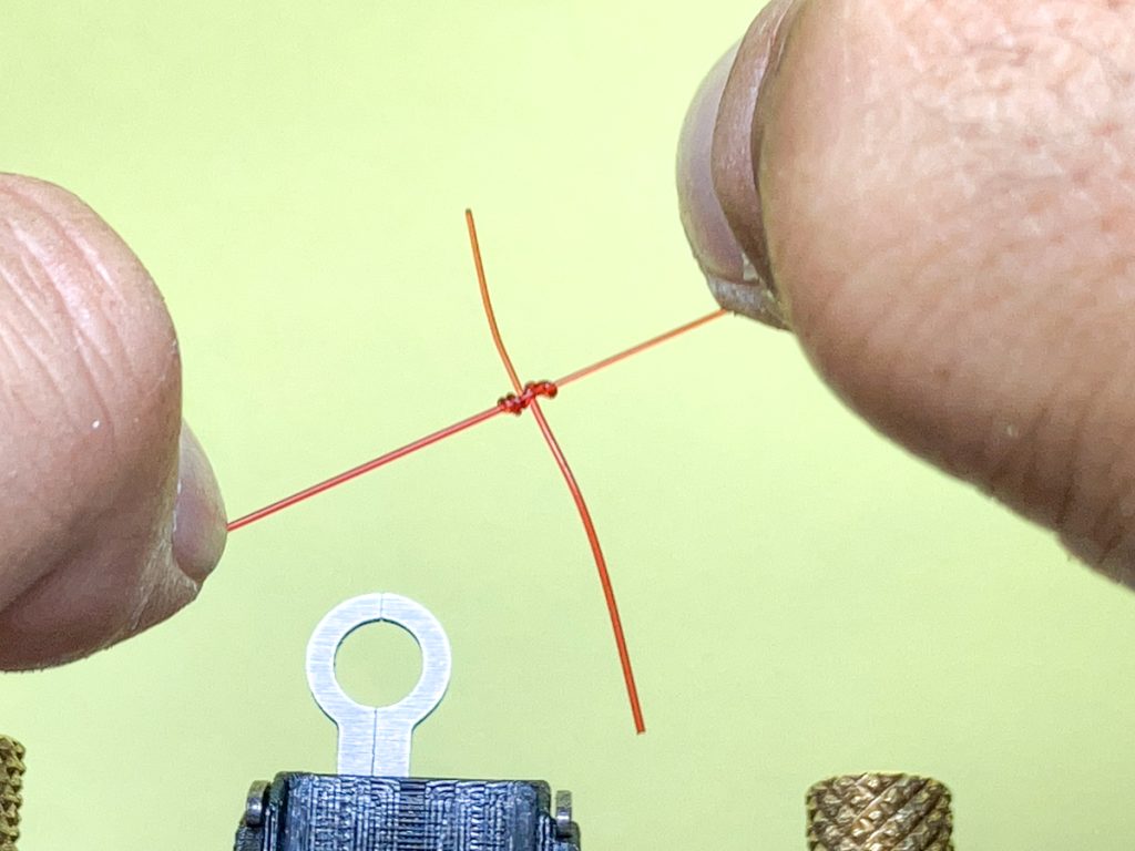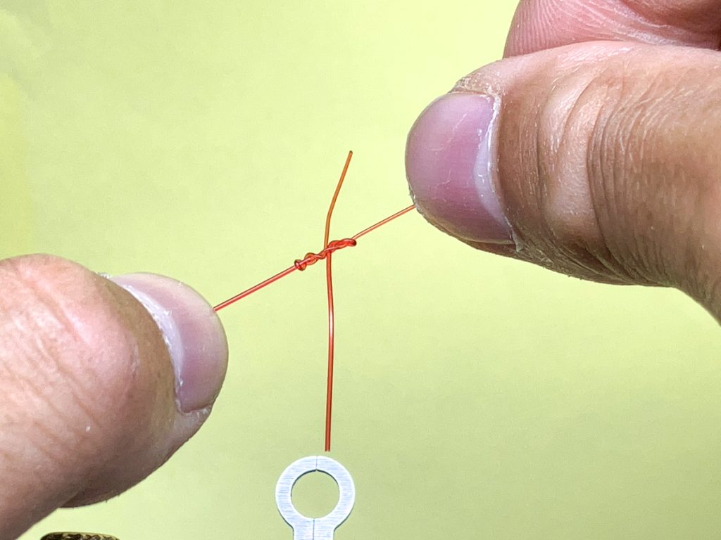 両手でゆっくりと左右から力を加えて引っ張り、結束を締め込みます。最後に余分をカットしてブラットノットの完了です。