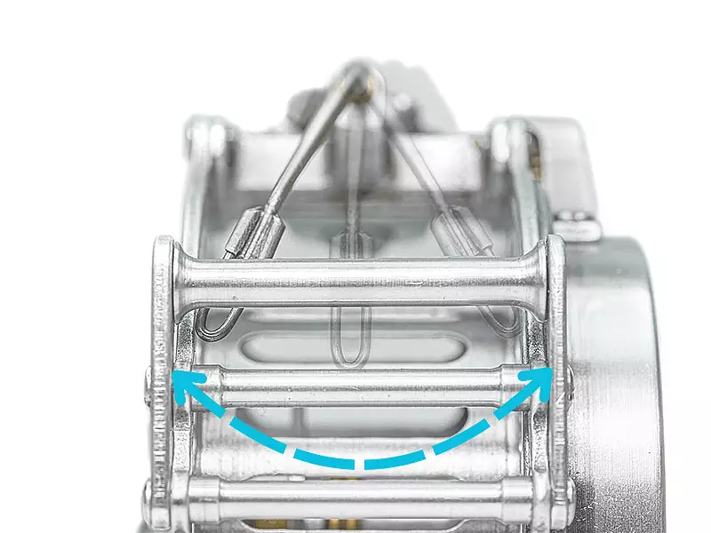 極力重量を減らすために95%のパーツはアルミニウムから削り出し、残りのブラスパーツはもちろん、ステンレス製のネジや可動パーツの一つ一つまで全てフランコが自分で削り出しています。