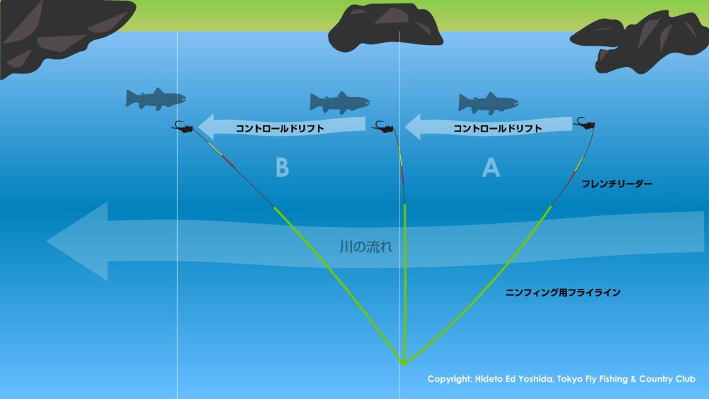 フライの流れる位置とサイターが並行に流れるようにフライラインをメンディングしながらコントロールドリフトします。
