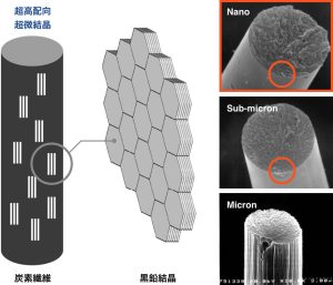 本来、炭素繊維の強さと硬さは、一方が高まればもう一方が下がる、というトレードオフの関係にありますが、東レ独自の「ナノアロイ®技術」により、繊維構造をナノレベル(10億分の1メートル)で制御する焼成技術を用いることで、強さと硬さを同時に高めることを実現しました。そこで誕生したのが、高強度タイプのトレカ®T1100Gです。