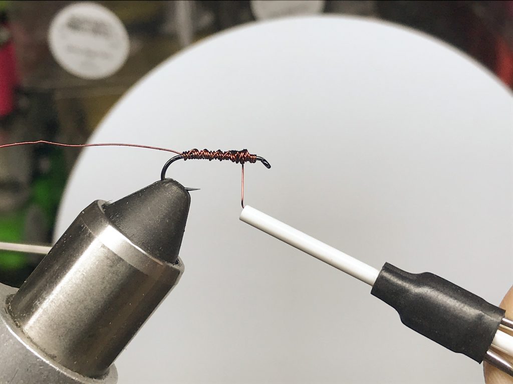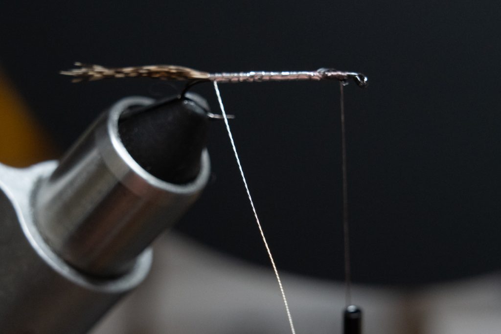 ワイヤーをスレッドとして使うことでウェイト&アンダーボディを作りつつ、結んだ端っこは切り取らず残しておけばそのままオーバーボディを補強・強調するためのリブとして使うことができます。
